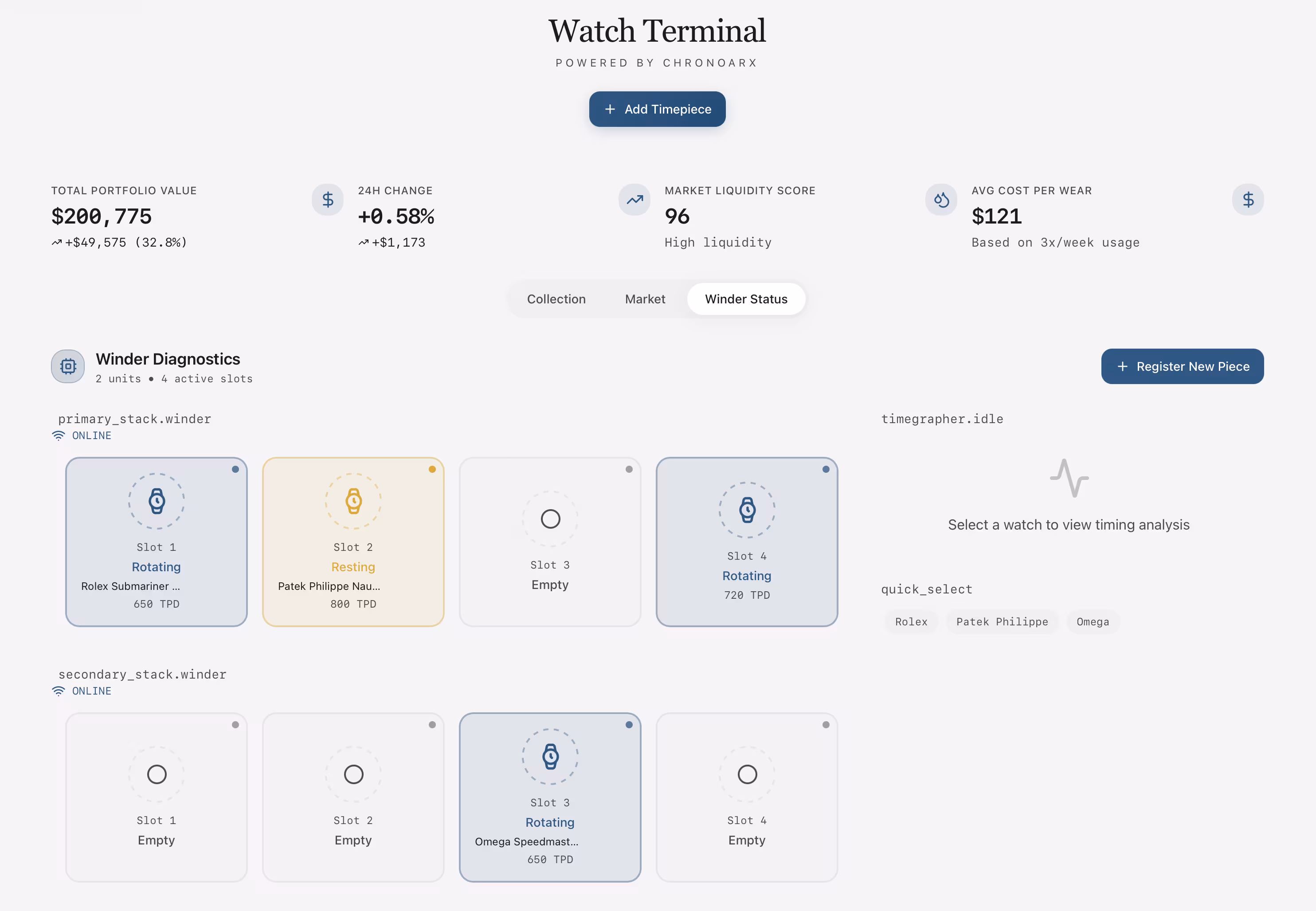 ChronoArx transforms your collection into a live portfolio, tracking market value and performance against global assets in real-time.